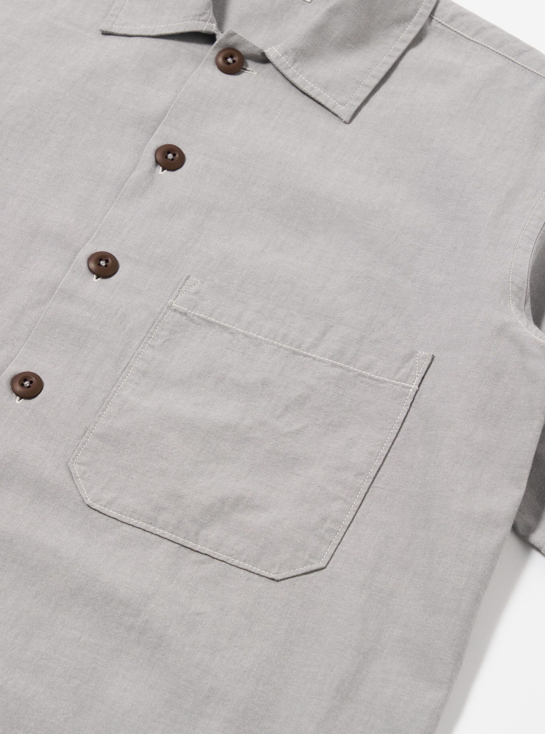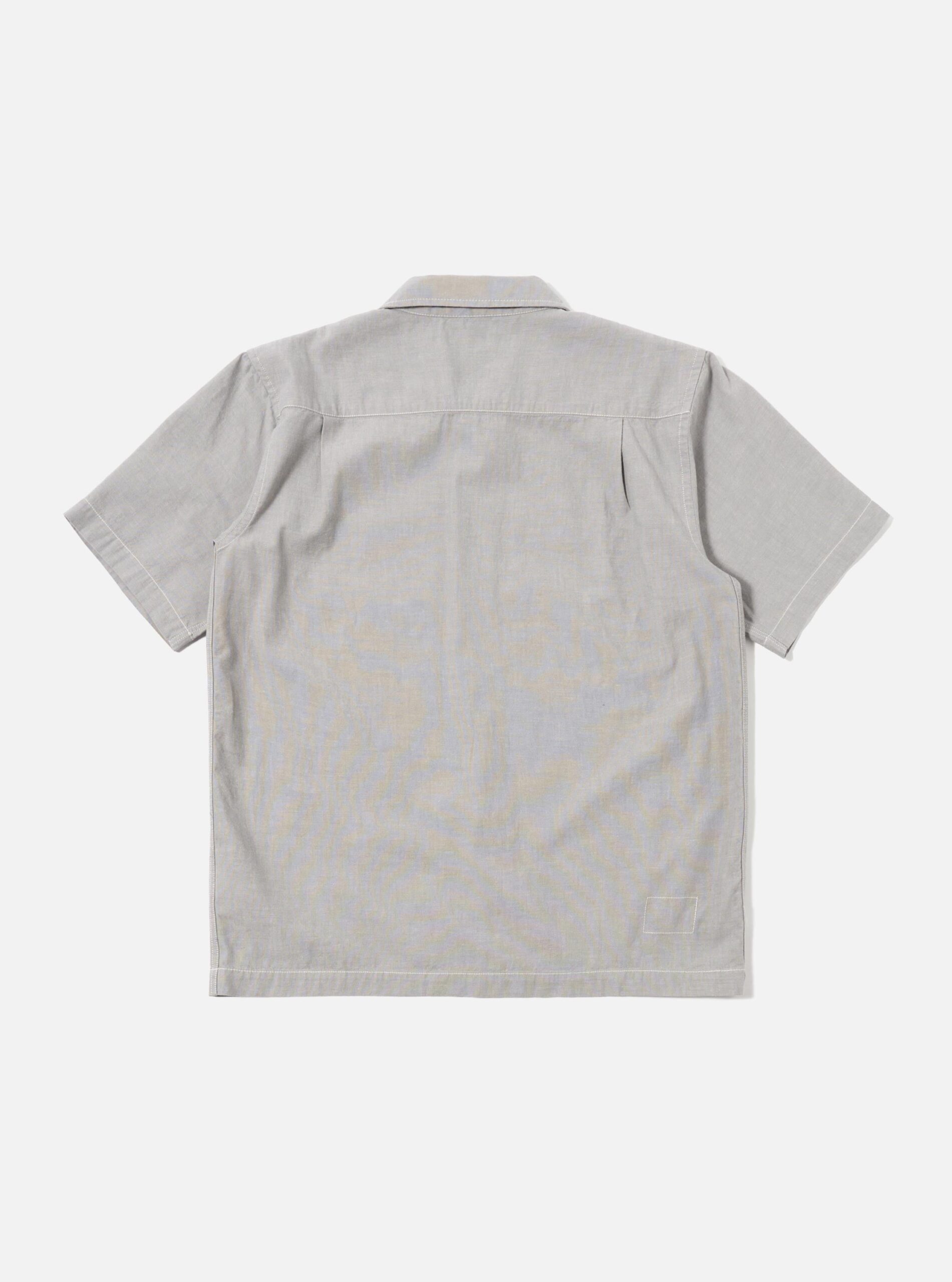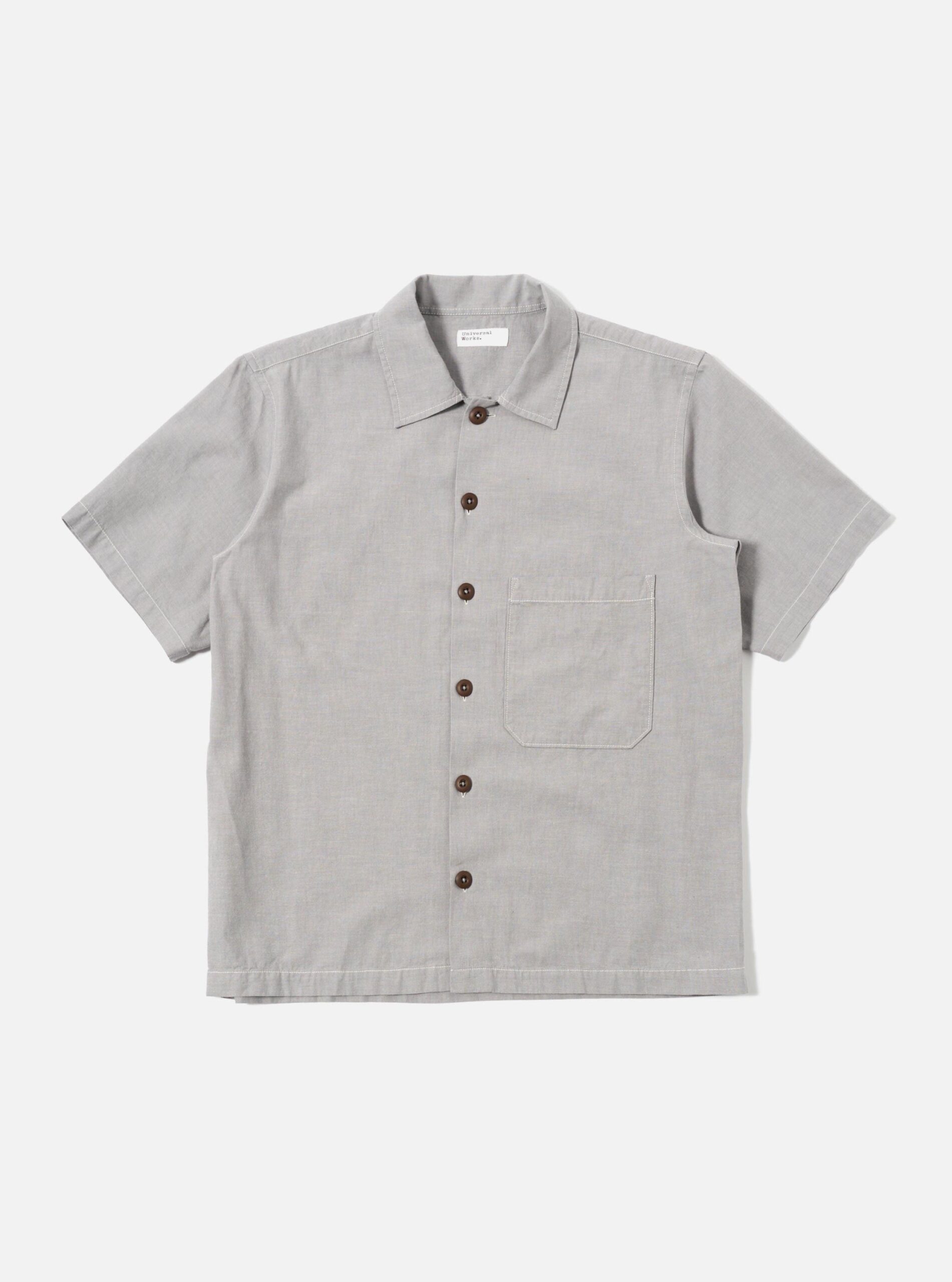 S/S Fatigue Shirt is a short sleeved. straight hemmed. oversized. short-ish overshirt with a wide sleeve and intentionally lowered patch pocket and contrast stitching.