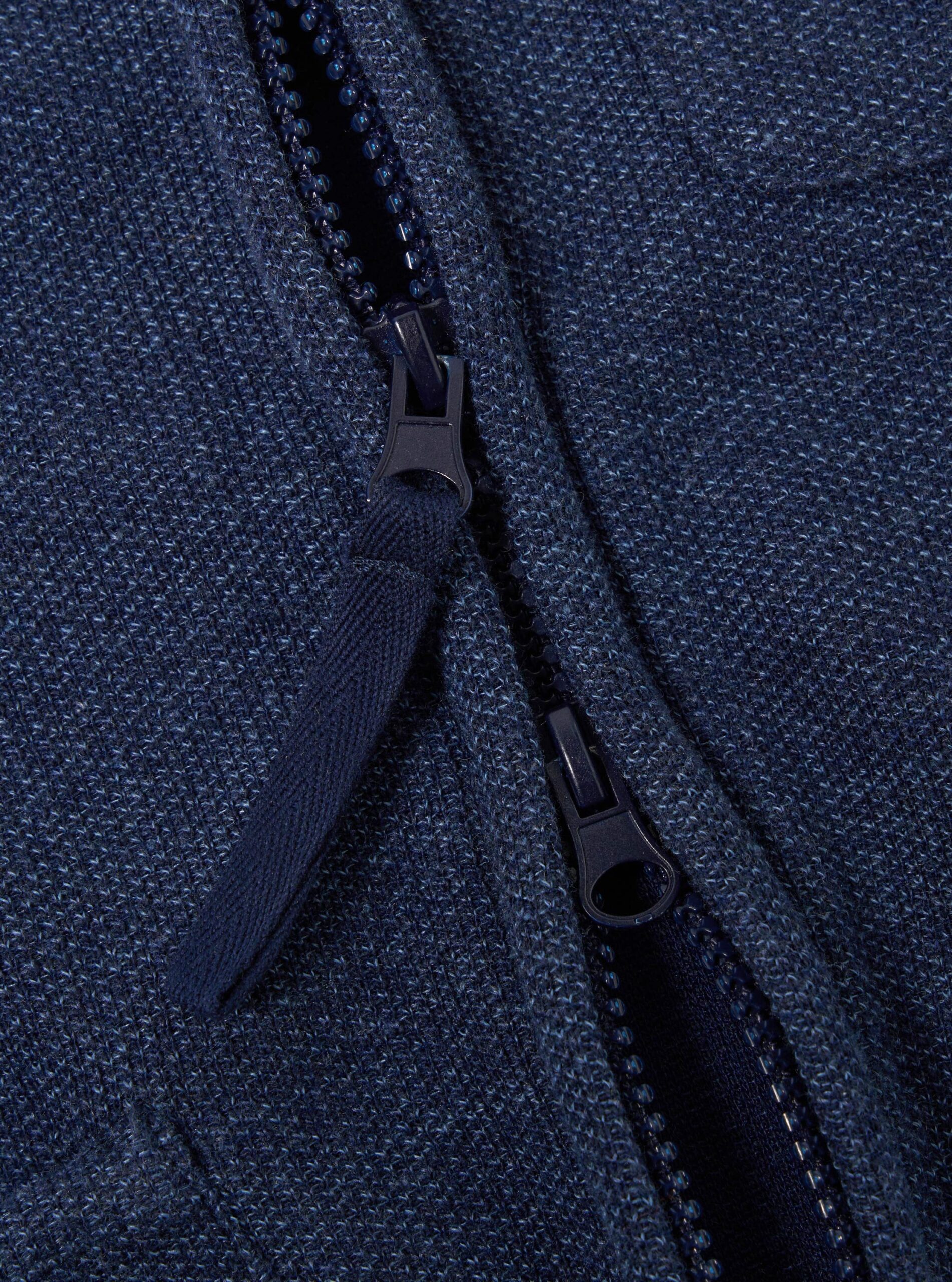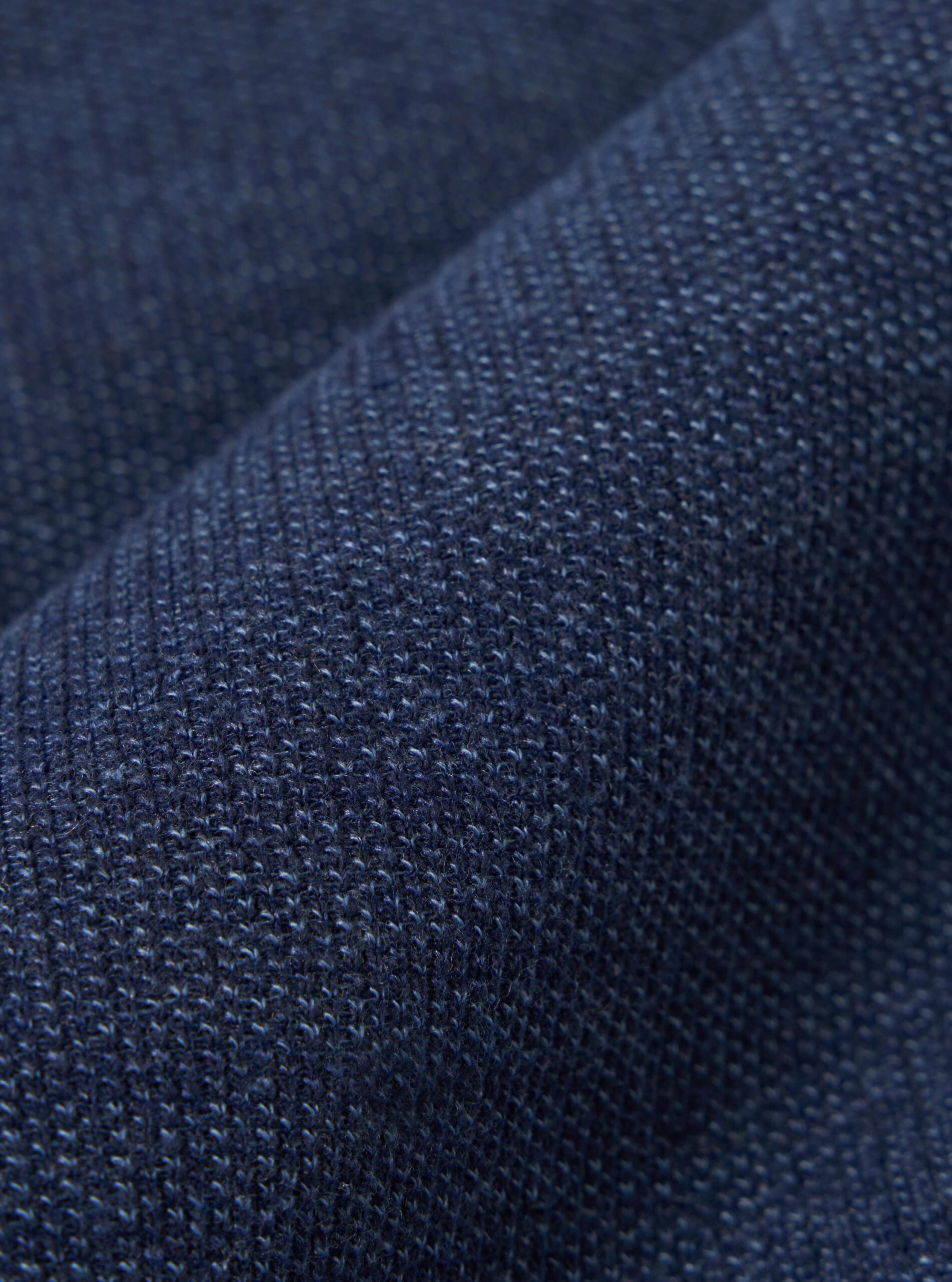 A light weight. basket weave. knitted fabric in an irregular-dyed. indigo look yarn.