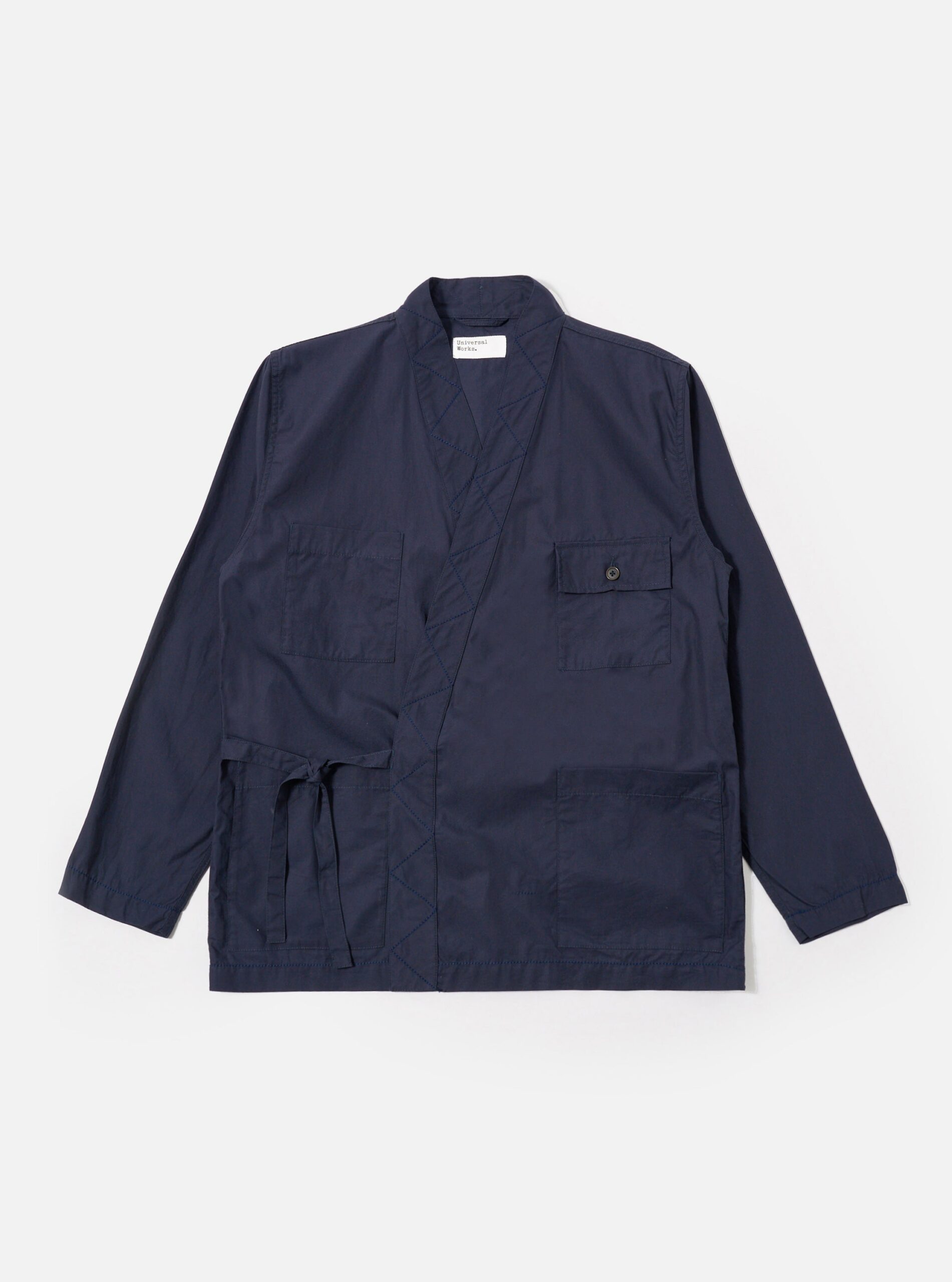 Based on our Kyoto Work Jacket. a wrap throw on tie front style. Osaka Work jacket has an extra button-down chest pocket and military-inspired contrast embroidery.